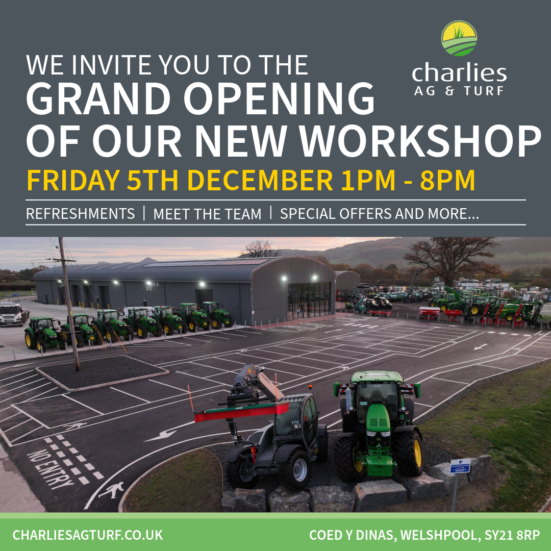 We invite you to join us for our grand opening of the new workshop here at Charlies Ag & turf, Welshpool. On Friday 5th December, from 1pm – 8pm. With special offers during the day, refreshments and able to meet the team. We look forward to welcoming you on Friday 5th!